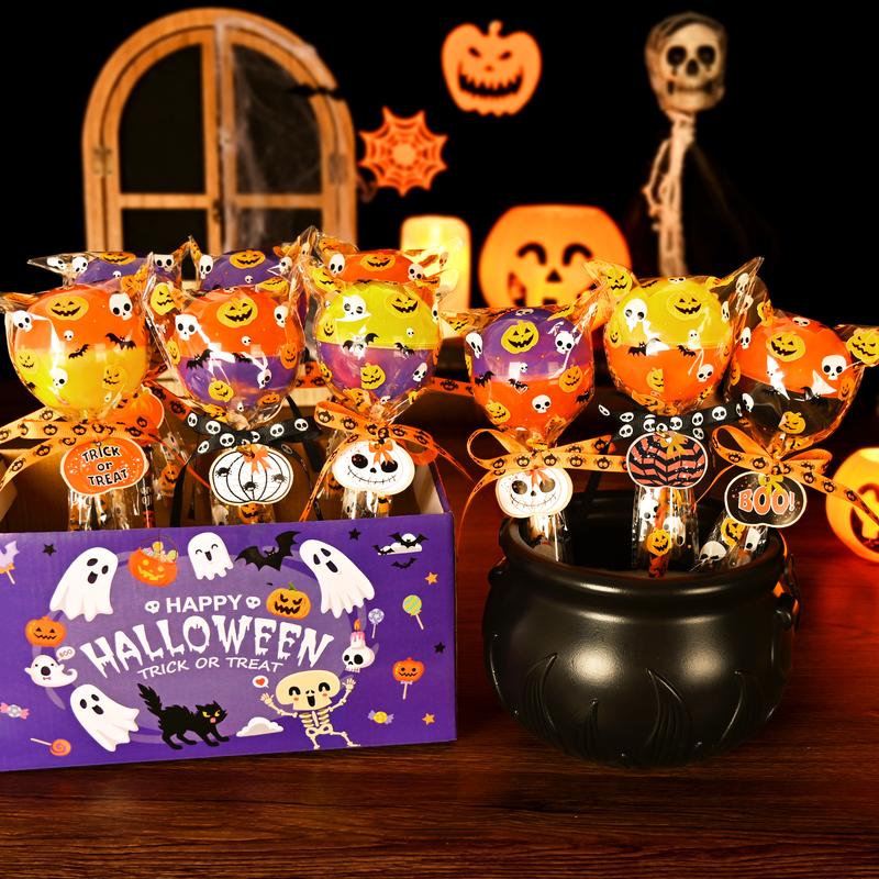 Each SpookyPop Classroom 24-Pack contains 24 individually wrapped lollipop-shaped packs.